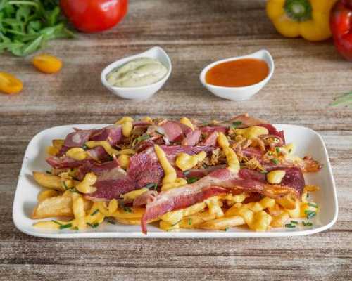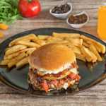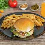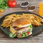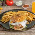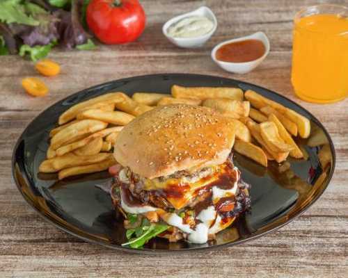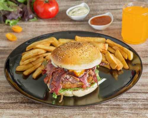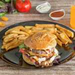 Bun's de boulanger, poitrine de bœuf halal grillé, galette de pomme de terre frit, bœuf haché frais halal 150 g "cuisson au choix", Cheddar fondant, jeune pousse de salade, dès de tomates, oignons caramélisés et sauce au choix. Servi avec 1 accompagnement et 1 boisson au choix.