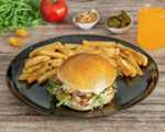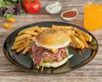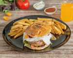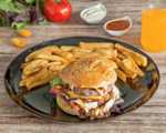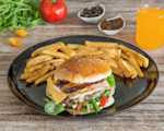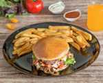 Bun's de boulanger, poitrine de bœuf halal grillé, galette de pomme de terre frit, bœuf haché frais halal 150 g "cuisson au choix", Cheddar fondant, jeune pousse de salade, dès de tomates, oignons caramélisés et sauce au choix. Servi avec 1 accompagnement et 1 boisson au choix.
